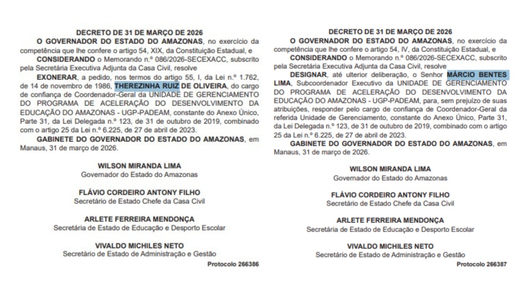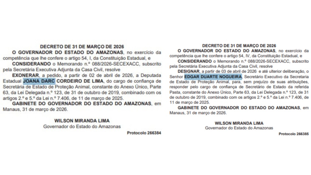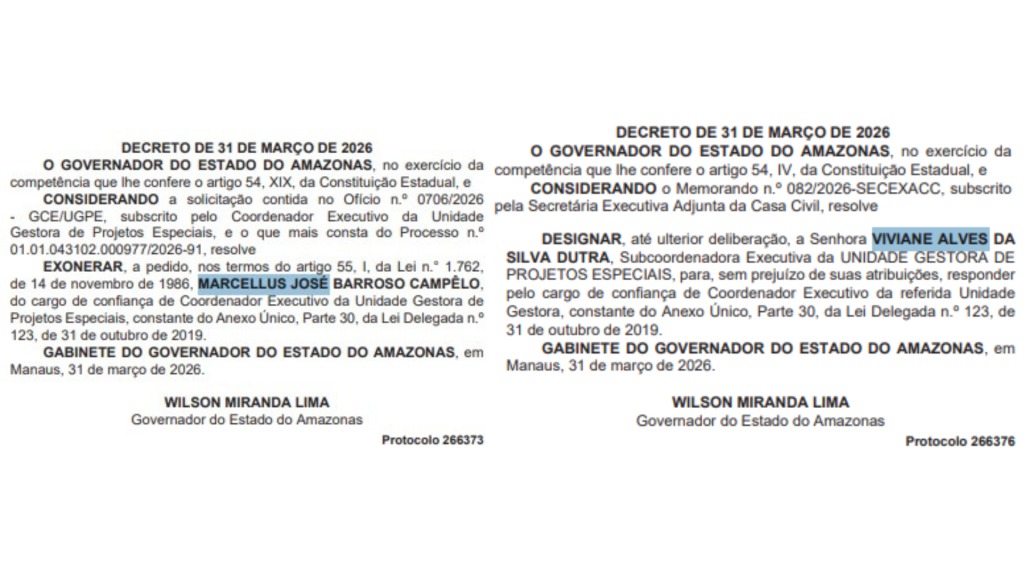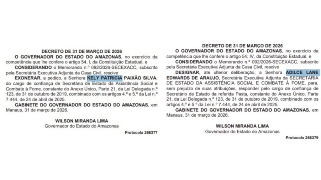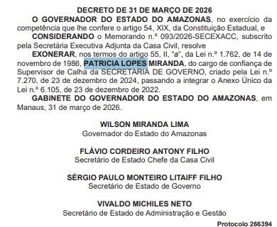 Patrícia Lopes – deixa o cargo de supervisora de Calha da Secretaria de Governo. Ex-prefeita de Presidente Figueiredo, foi lançada como pré-candidata a deputada federal. Não foi divulgado substituto.