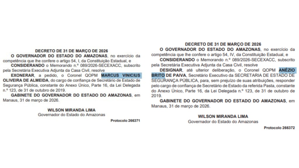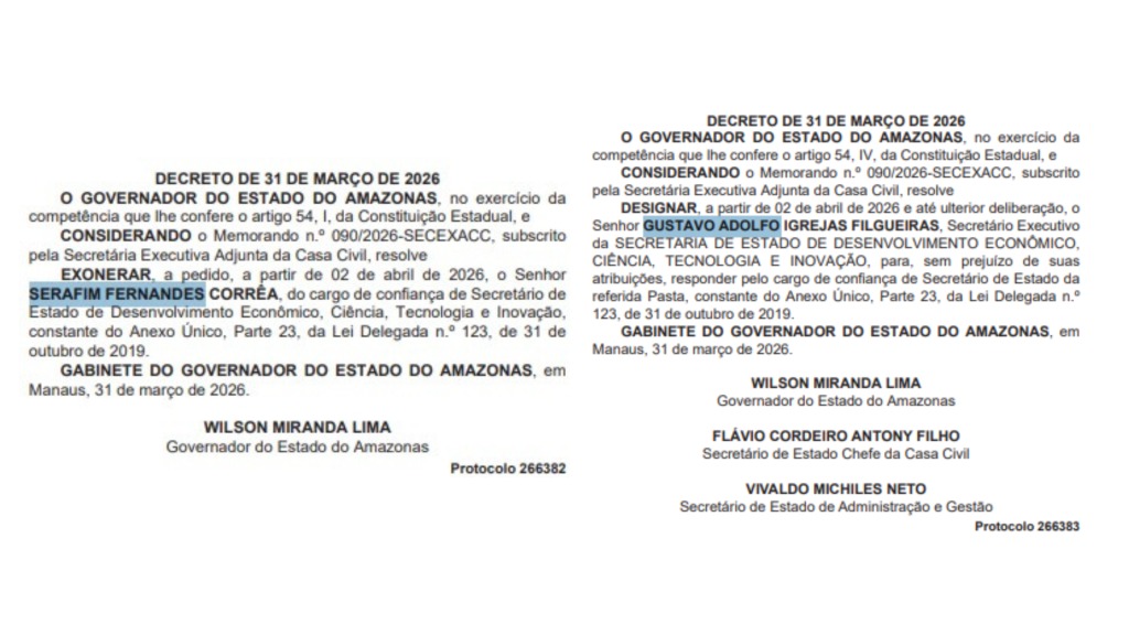 O governador do Amazonas, Wilson Lima (União Brasil), oficializou nesta quinta-feira, 2, a exoneração de nove secretários e dirigentes de órgãos estratégicos do primeiro escalão e da administração indireta. As mudanças foram publicadas no Diário Oficial do Estado e atendem ao prazo de desincompatibilização previsto na legislação eleitoral, que exige o afastamento de cargos públicos até seis meses antes das eleições.