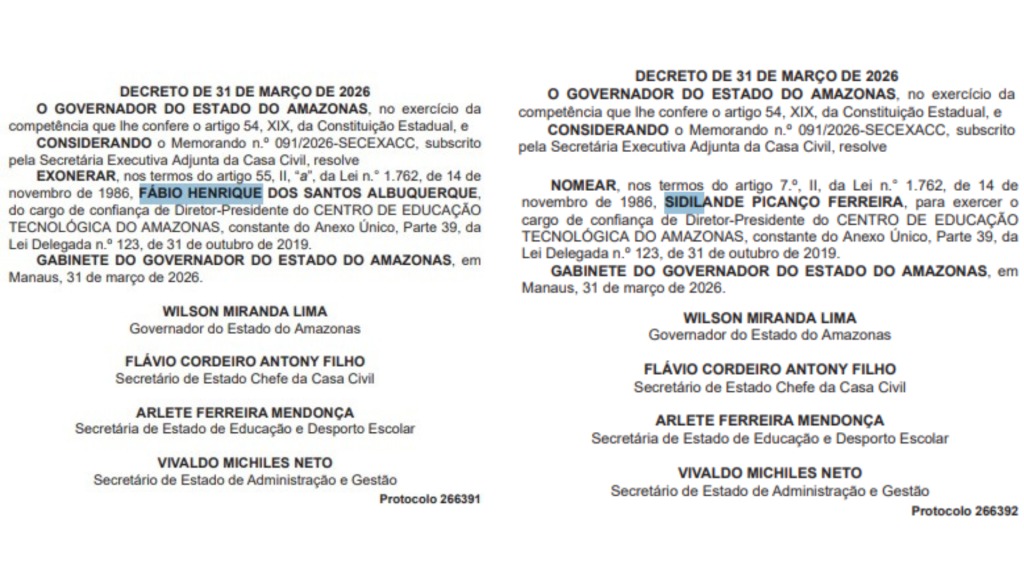 Fábio Albuquerque – deixa o cargo de diretor-presidente do Centro de Educação Tecnológica do Amazonas (Cetam) e deve disputar uma das cadeiras na Aleam. Sidilande Picanço Ferreira assume a pasta.