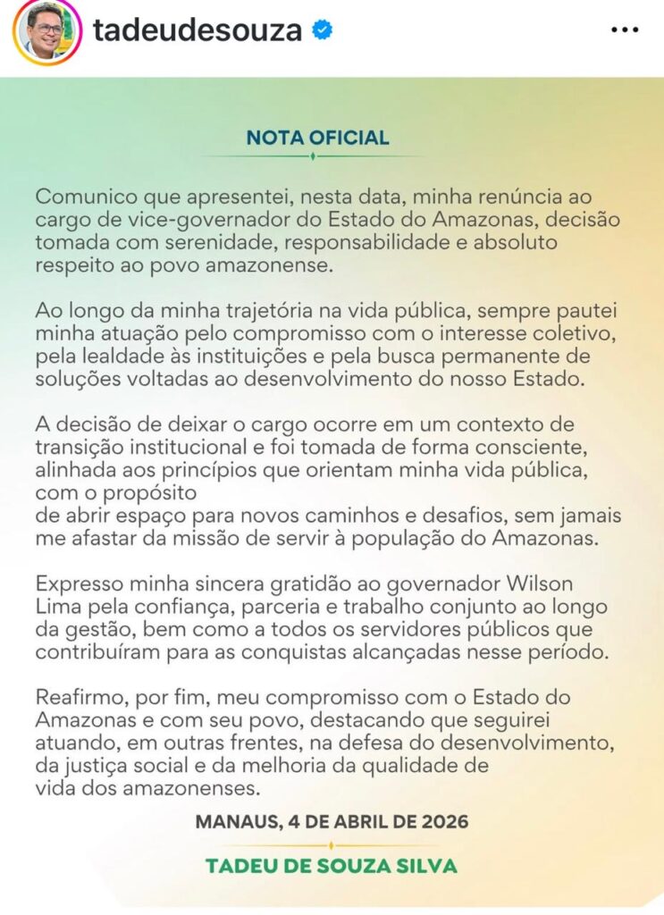 Nas redes sociais, Tadeu de Souza comunicou a decisão e afirma que a medida foi tomada com “serenidade, responsabilidade e absoluto respeito ao povo amazonense”.