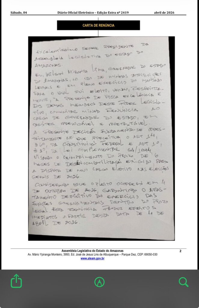 O portal O Convergente teve acesso à carta de renúncia do governador Wilson Lima e do vice-governador Tadeu de Souza. Veja: