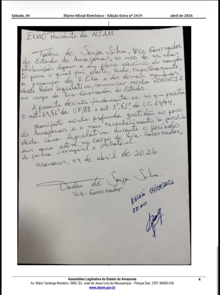 “Comunico que apresentei, nesta data, minha renúncia ao cargo de vice-governador do Estado do Amazonas, decisão tomada com serenidade, responsabilidade e absoluto respeito ao povo amazonense.