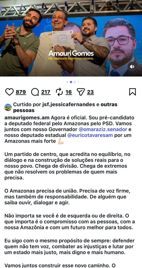 Outro nome que surge na disputa é o vereador Amauri Gomes, que se filiou ao PSD durante a janela partidária e também pretende concorrer a uma vaga na Câmara dos Deputados. Ele anunciou a pré-candidatura em evento ao lado do senador Omar Aziz (PSD), líder nacional da legenda e também pré-candidato ao Governo do Amazonas.