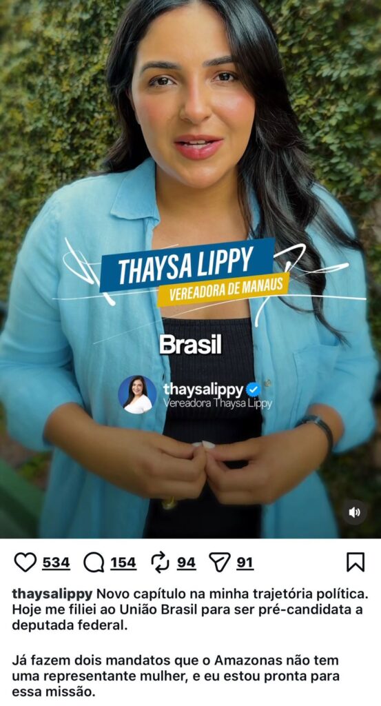 Pelo União Brasil, a vereadora Thaysa Lippy também anunciou que deve entrar na corrida eleitoral. Durante lançamento de pré-candidatura, a parlamentar destacar a falta de representatividade feminina na Câmara Federal e disse “que já está na hora do Amazonas ter uma mulher deputada federal” para representar o povo.