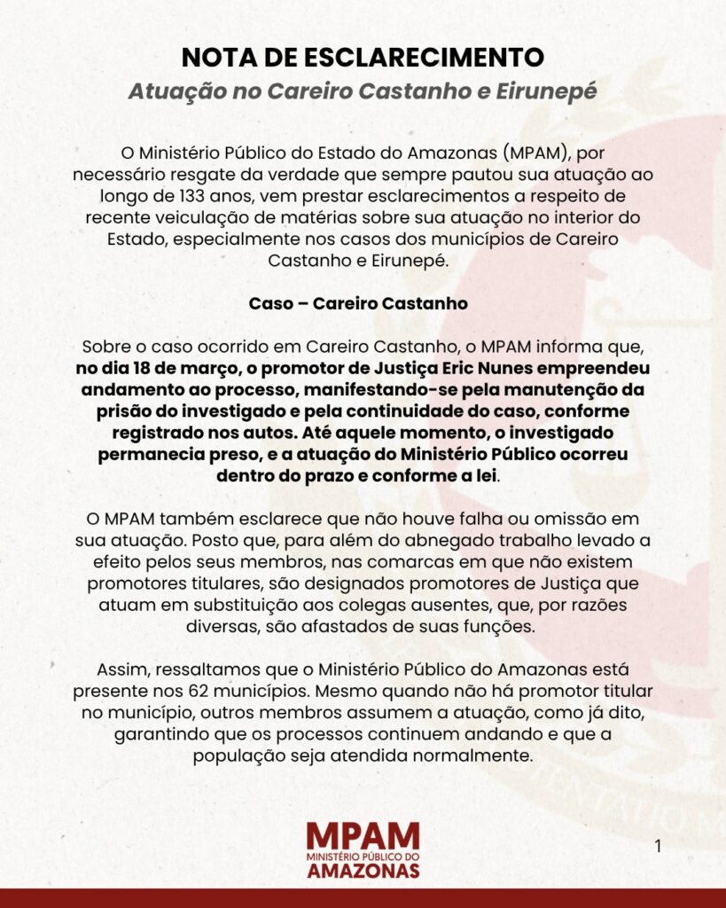 O Ministério Público do Amazonas divulgou esclarecimentos sobre sua atuação em dois casos recentes ocorridos nos municípios de Careiro Castanho e Eirunepé, rebatendo críticas e negando qualquer falha ou omissão nos procedimentos adotados.
