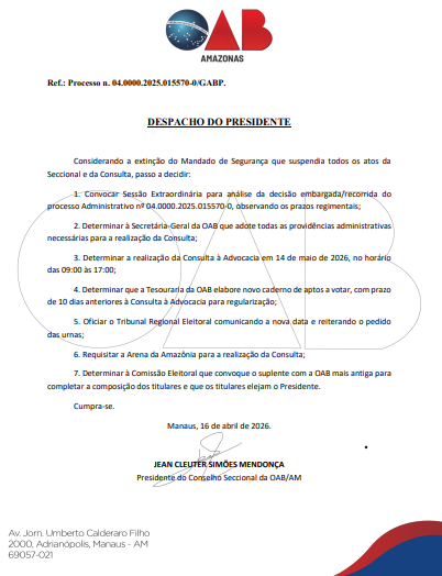 O despacho também prevê a convocação de uma sessão extraordinária para análise de recurso no âmbito do processo administrativo relacionado à consulta. A Secretaria-Geral da OAB-AM ficará responsável por conduzir as providências necessárias para a realização do pleito.