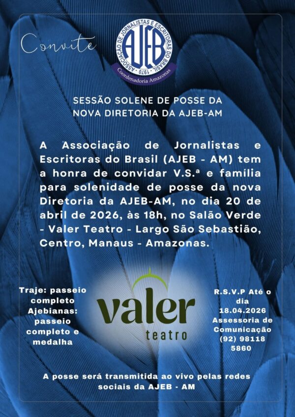 A nova diretoria da Associação de Jornalistas e Escritoras do Brasil – Coordenadoria Amazonas (AJEB-AM), para o biênio 2026/2028, toma posse nesta segunda-feira (20), às 18h, no Salão Verde da Valer Teatro, no Centro de Manaus.