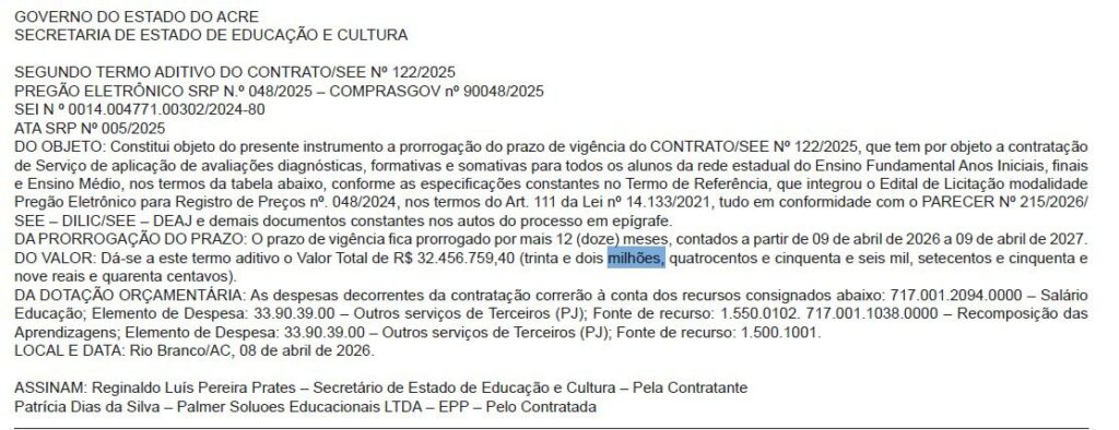 O Governo do Acre prorrogou por mais 12 meses um contrato milionário voltado à aplicação de avaliações educacionais na rede pública estadual. O Segundo Termo Aditivo do Contrato foi publicado no Diário Oficial do Estado no dia 13 de abril de 2026, já sob a gestão da governadora Mailza Assis (PP), e prevê um custo total de R$ 32.456.759,40.
