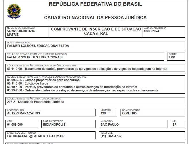 A empresa responsável pela execução dos serviços é a Palmer Soluções Educacionais LTDA – EPP, representada pela sócia-administradora Patrícia Dias da Silva, que também assinou o aditivo. Segundo informações da Receita Federal, a empresa foi fundada em março de 2024, possui sede em São Paulo e capital social de R$ 2,5 milhões. Sua atividade econômica principal está relacionada ao tratamento de dados, serviços de aplicação e hospedagem na internet.